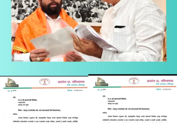 *पंढरपूर  नगरपरिषदेस सौर ऊर्जा प्रकल्पासाठी निधी मिळावा:- मा.आ. प्रशांत मालक परिचारक*   *(मा आमदार प्रशांत  परिचारक यांनी घेतली उपमुख्यमंत्री एकनाथजी शिंदे साहेब यांची विविध मागण्यासाठी भेट)