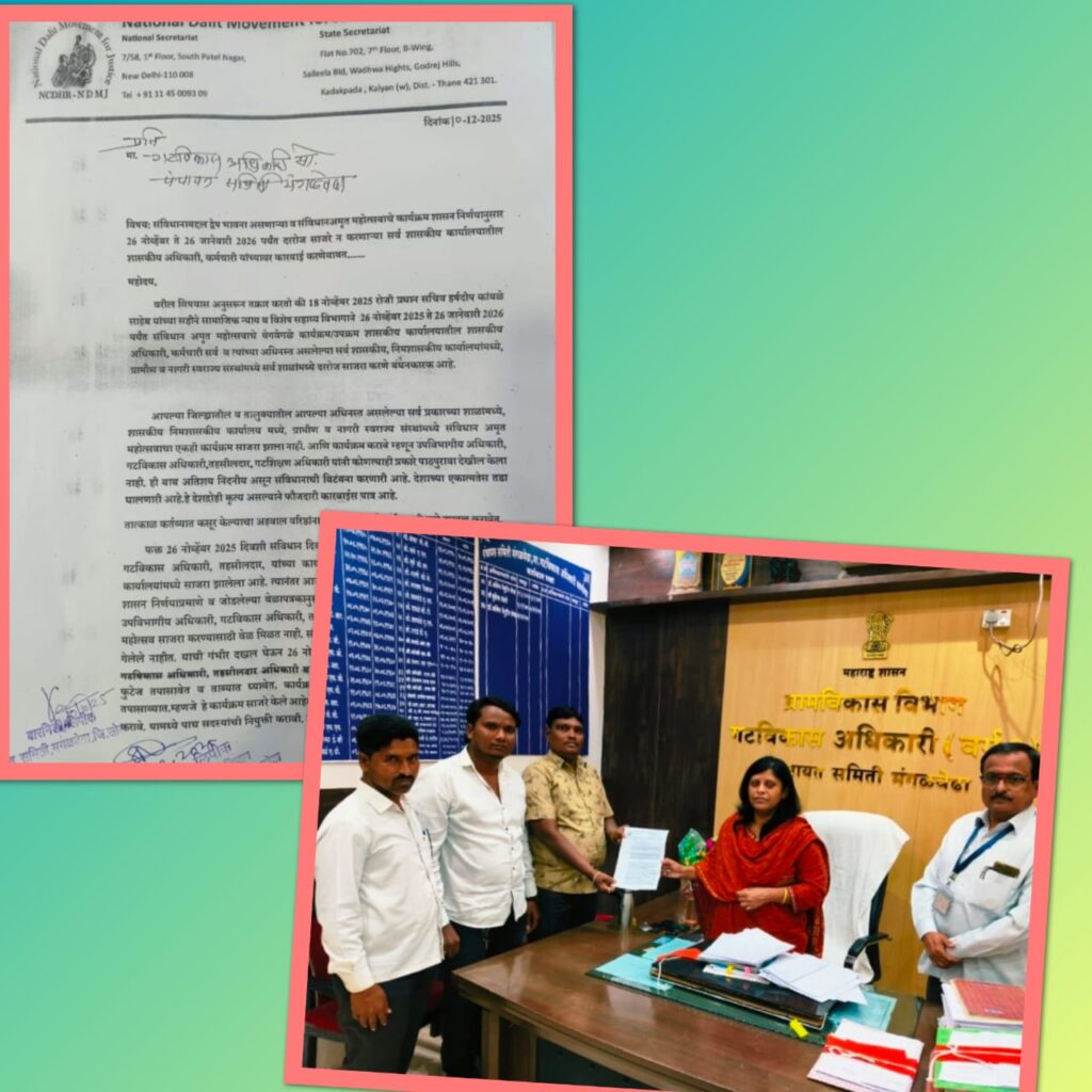 संविधानाबद्दल द्वेष भावना व संविधान.अमृत महोत्सवाचे कार्यक्रम शासन निर्णयानुसार २६ नोव्हेंबर ते २६ जानेवारी २०२६रोजी साजरे न करणाऱ्या सर्व शासकीय कार्यालयातील शासकीय अधिकारी व कर्मचारी त्यांच्यावर कार्यवाही करण्याबाबत आज नॅशनल दलित मुव्हमेंट फॉर जस्टीस यांच्या वतीने निवेदन सादर करण्यात आले.. या निवेदनामध्ये, या संघटनेचे जिल्हा प्रसिद्धीप्रमुख येताळा खरबडे यांनी