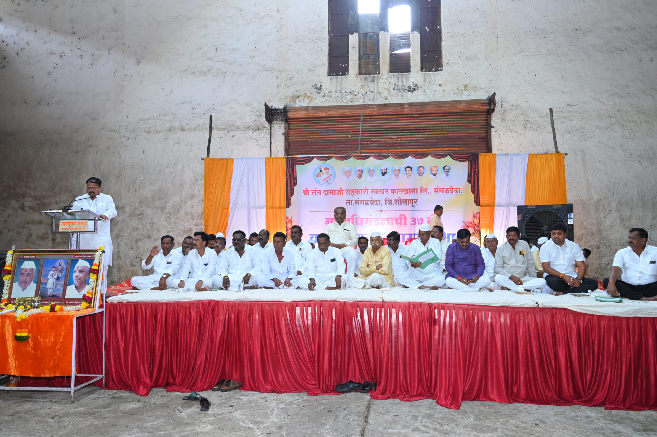 श्री संत दामाजी सहकारी साखर कारखान्याची अधिमंडळाची ३७ वी वार्षिक सर्वसाधारण सभा कारखाना कार्यस्थळावर संपन्न झाली। सभेच्या सुरुवातीला कारखान्याचे संस्थापक चेअरमन स्व।कि।रा। मर्दा तसेच संस्थापक व्हा चेअरमन स्व।रतनचंद शहा शेठजी, श्री संत दामाजीपंत यांच्या प्रतिमेचे पूजन कारखान्याचे मार्गदर्शक प्रा।शिवाजीराव काळुंगे, चेअरमन श्री शिवानंद पाटील, व्हा।चेअरमन श्री तानाजीभाऊ खरात, कारखान्याचे माजी चेअरमन अùड।नंदकुमार पवार, रतनचंद शहा बँकेचे चेअरमन श्री राहूल शहा, माजी व्हा।चेअरमन श्री रामचंद्र वाकडे, बळीराजा पतसंस्थेचे चेअरमन श्री दामोदर देशमुख, उपस्थित संचालक व मान्यवरांचे हस्ते करण्यात आले। कार्यक्रमाची अध्यक्षीय सुचना संचालक औदुंबर वाडदेकर यांनी मांडली व त्यास संचालक भारत बेदरे यांनी अनुमोदन दिले।