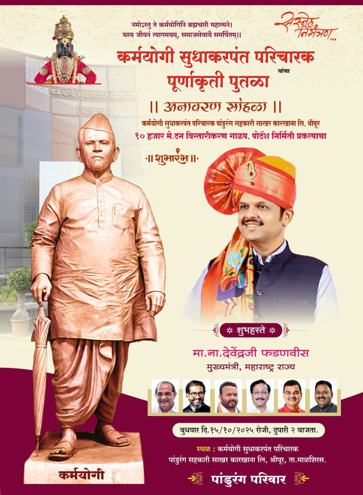 श्रीपुर येथील कर्मयोगी सुधाकर पंत परिचारक पांडुरंग सहकारी साखर कारखाना या ठिकाणी स्वर्गीय कर्मयोगी सुधाकर पंत परिचारक यांच्या भव्य पुतळ्याचे अनावरण होणार असून सर्व शेतकरी सभासद कार्यकर्ते तसेच स्वर्गीय सुधाकर पंत परिचारक प्रेमी हे उपस्थित राहणार आहेत.
